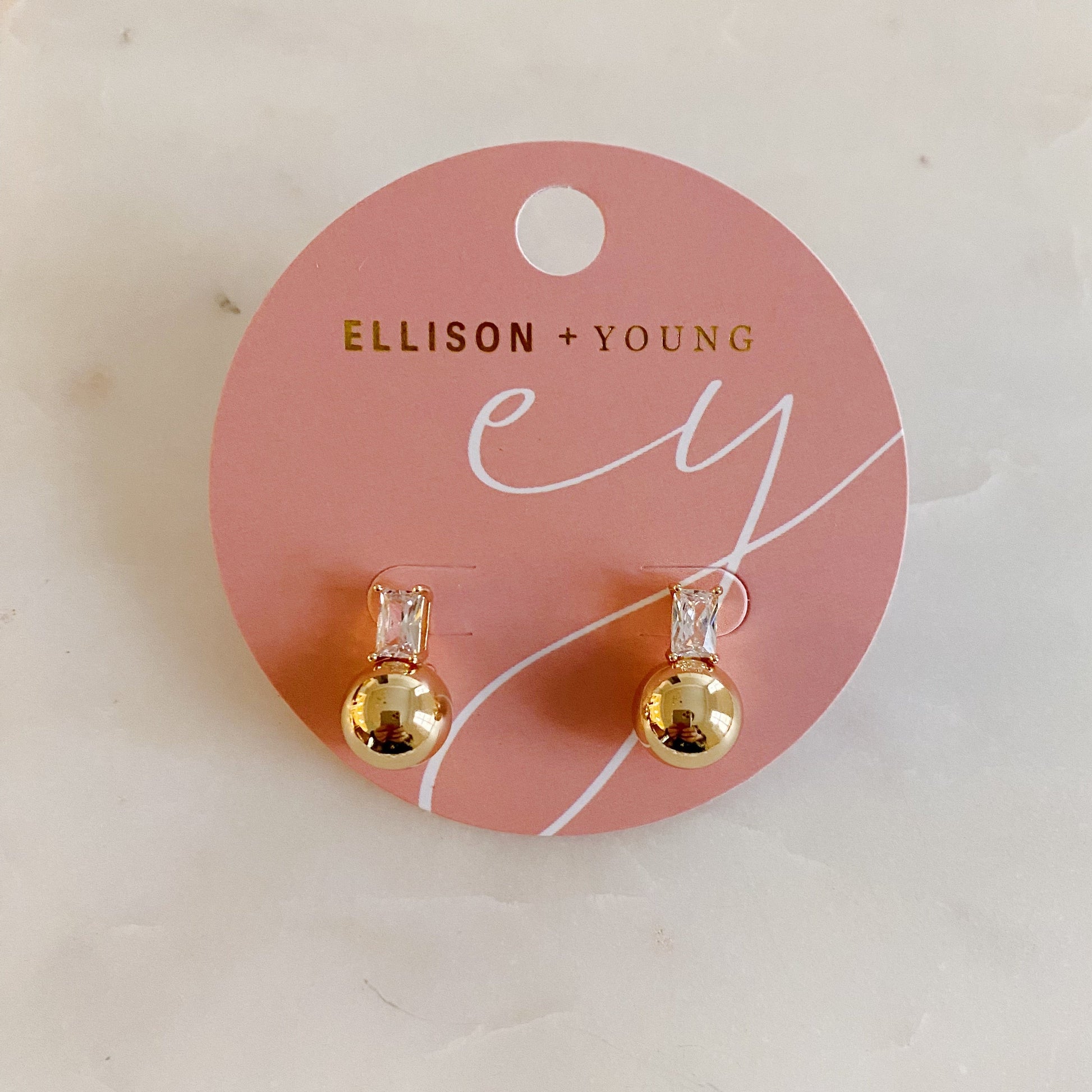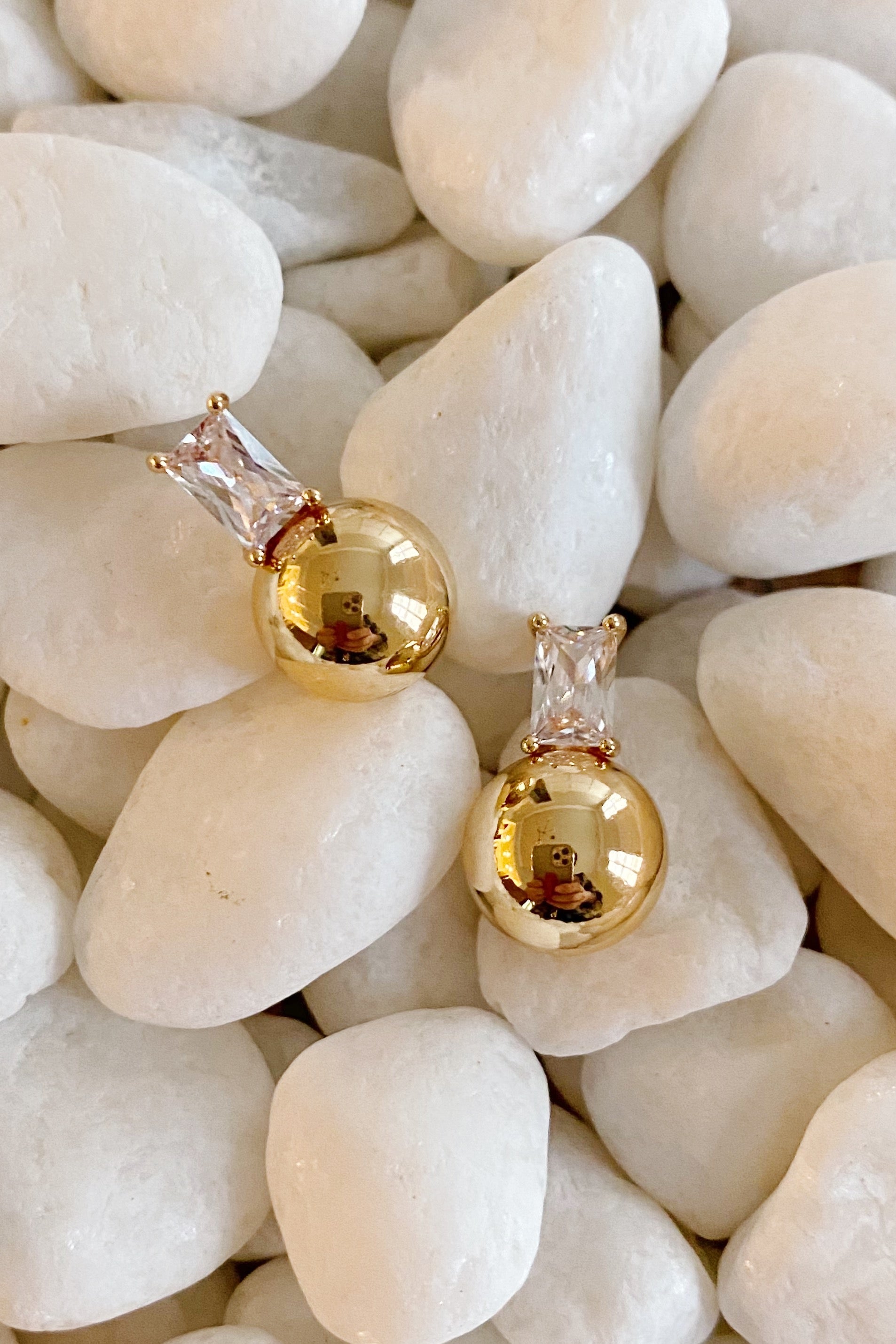 ¡Preciosa combinación de circonitas brillantes de corte princesa con una elegante bola dorada! Sencillo y bonito.