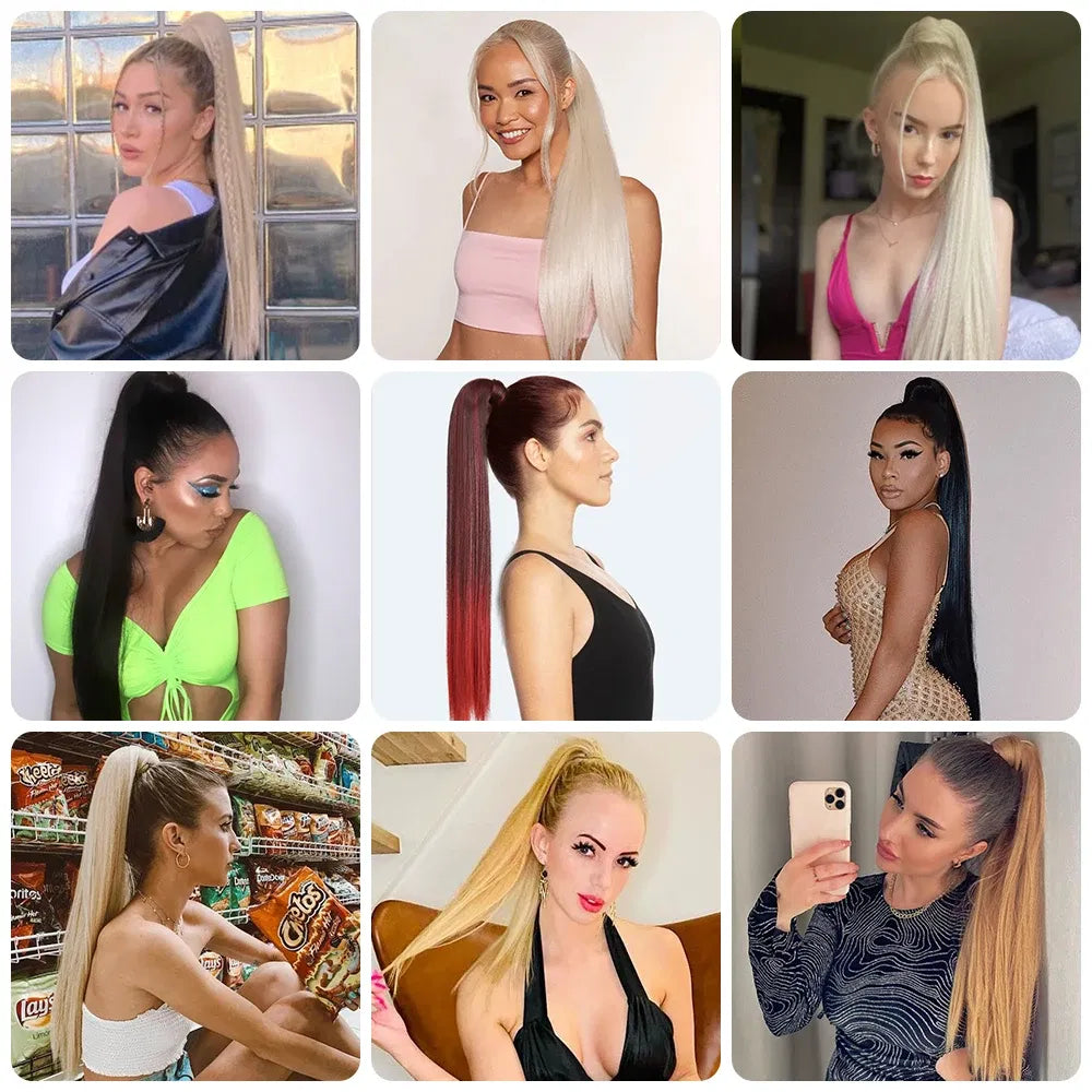 Color: P2/613, Largo estirado: 34 pulgadas - AZQUEEN Postizo sintético liso con cola de caballo de 85 cm, extensiones de cabello con clip envolventes súper largas, cola de caballo para uso diario