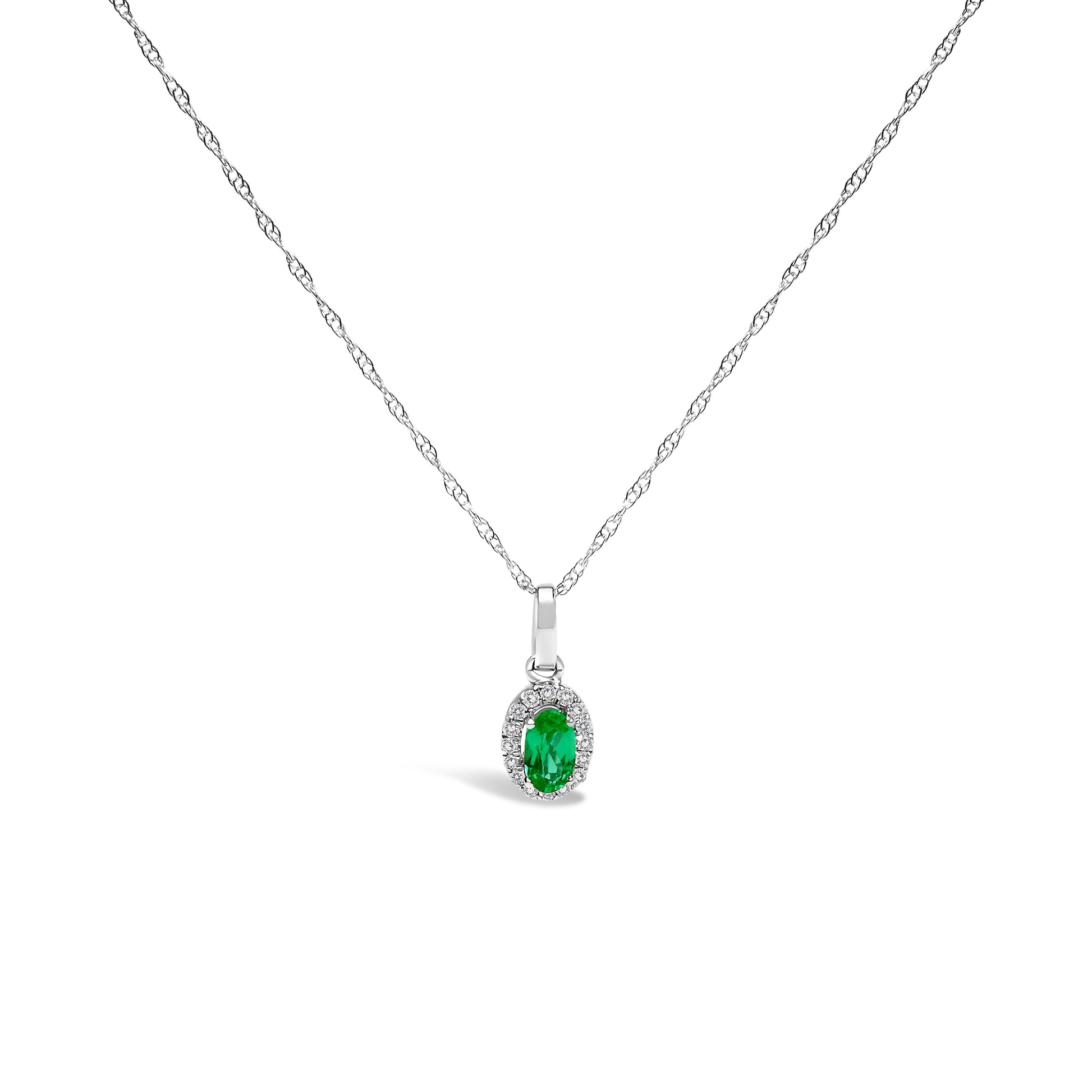 10K White Gold 5x3mm Green Emerald and Diamond Accent Halo Oval Shape 18" Pendant Necklace (I-J Color, I1-I2 Clarity)